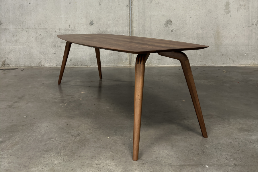 Deze bijzondere eettafel is geïnspireerd op de golvende lijnen van water en vis, en valt direct op door zijn elegante, organische vormgeving. Perfect als blikvanger in zowel moderne als klassieke interieurs.