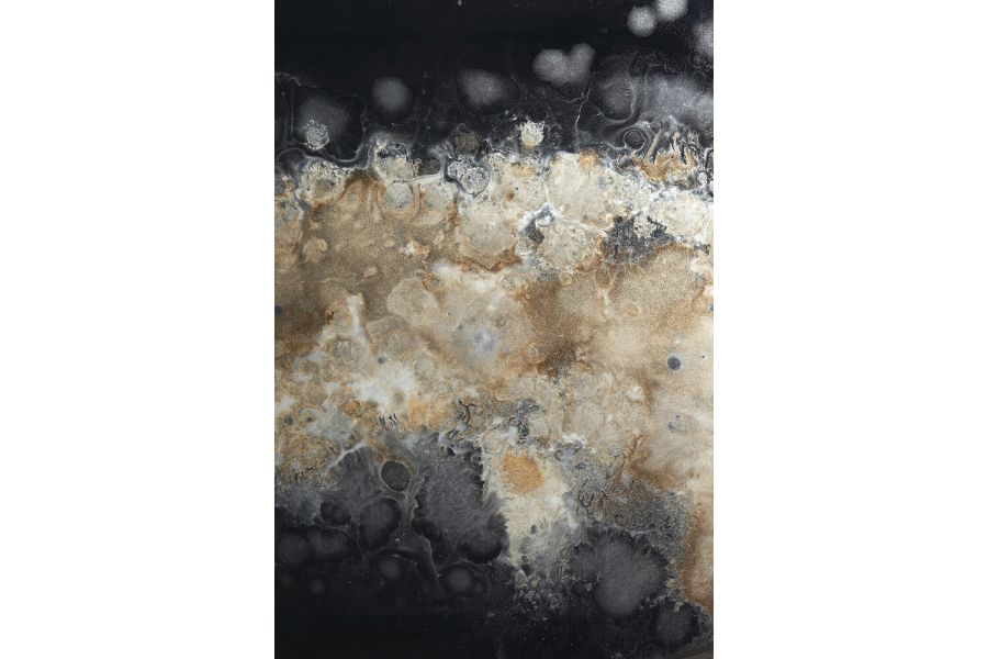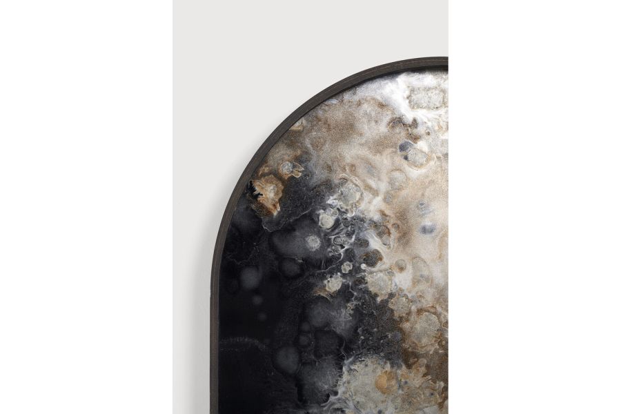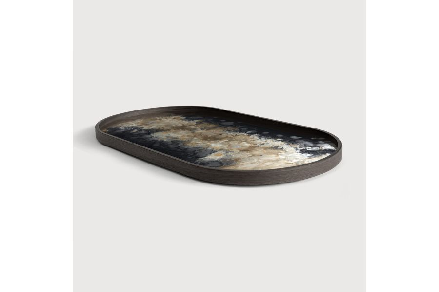 Een ingetogen kleurenpalet ontmoet betoverende motieven, geïnspireerd door de natuur en reizen. Dit Black Organic glazen dienblad experimenteert met het evenwicht tussen rijke patronen en gedempte tonen, waardoor de schoonheid achter de bedrieglijk alledaagse onderwerpen onthuld wordt. Zo vangt deze collectie de essentie van tijdloosheid. Handgeschilderd glas met een houten rand.