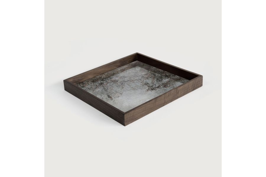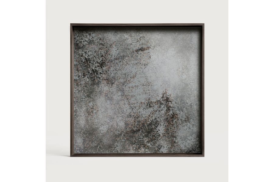 Een ingetogen kleurenpalet ontmoet betoverende motieven, geïnspireerd door de natuur en reizen. Dit Clear spiegel dienblad experimenteert met het evenwicht tussen rijke patronen en gedempte tonen, waardoor de schoonheid achter de bedrieglijk alledaagse onderwerpen onthuld wordt. Zo vangt deze collectie de essentie van tijdloosheid. Te combineren met de dienblad bijzet- en koffietafels.Verouderde spiegel - houten rand.