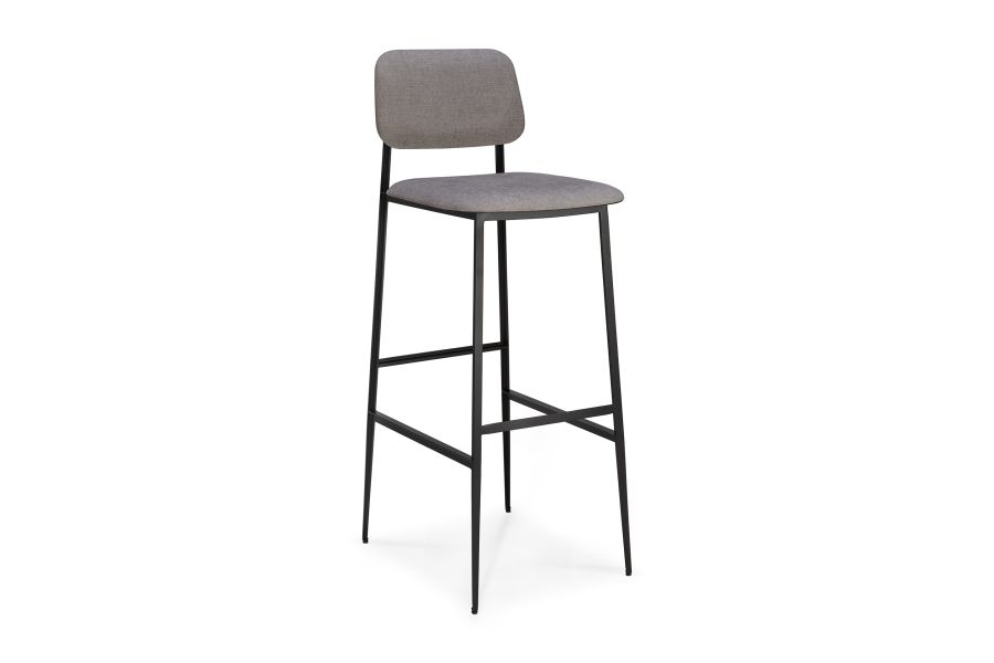 De DC hoge krukken, ontworpen door Djordje Cukanovic, zijn gebaseerd op de typische luchtige contouren van de DC eetkamerstoelen. Verkrijgbaar met of zonder rugleuning. Zwart metalen frame met een lichtgrijze bekleding. Zithoogte 83 cm