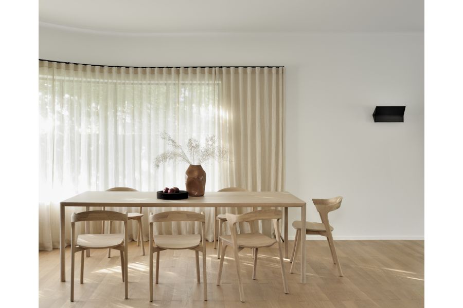 Het tafelblad lijkt moeiteloos te zweven boven de strakke, afgeschuinde poten. De eiken Air is een sterke en slanke eettafel vermomd in een eenvoudig, strak en minimaal design. Geïnspireerd door de lichtheid van het gelijknamige bed.