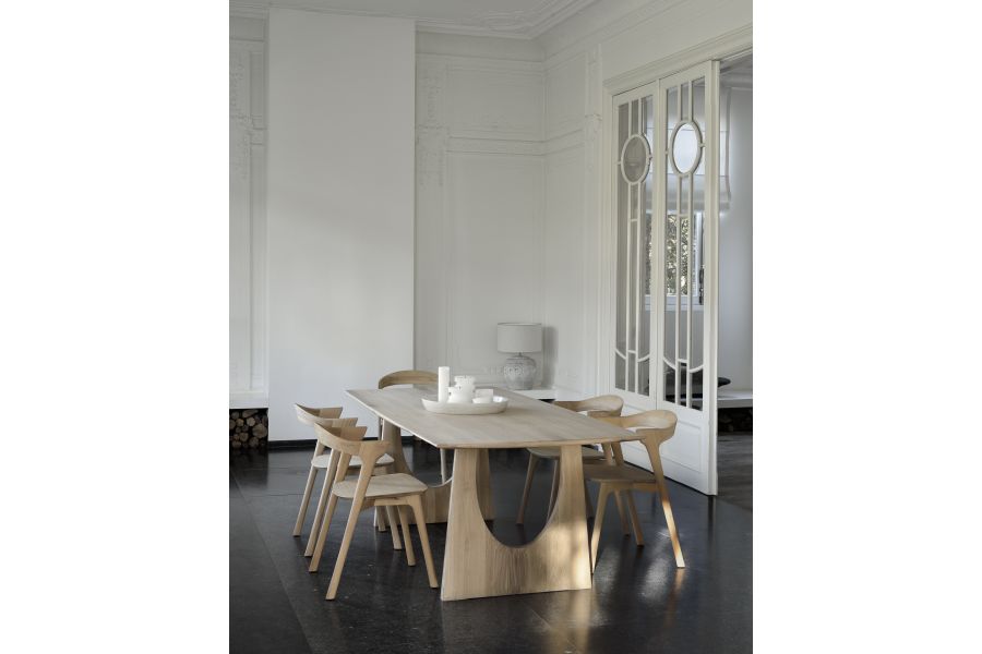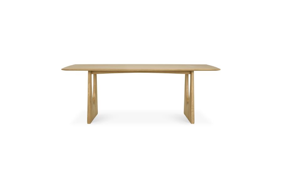 De geometrische massief eiken eettafel, met zijn rijke vormen en onverwachte details, is een pronkstuk dat zich zowel in de eetkamer als op de werkplek voelt. De lengte wordt gebalanceerd door afgeronde randen en natuurlijke lijnen. De bijzondere vormen zorgen voor extra volume en praktisch comfort.