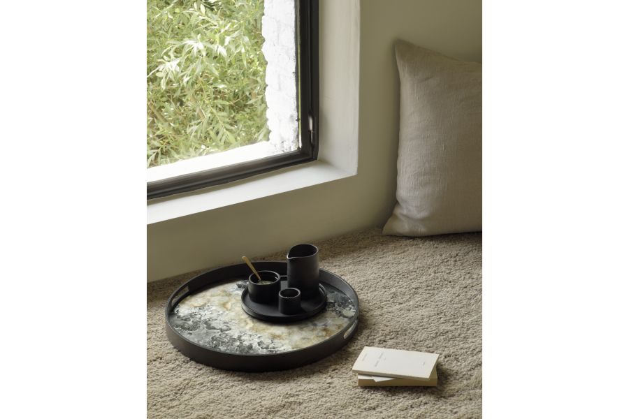Een ingetogen kleurenpalet ontmoet betoverende motieven, geïnspireerd door de natuur en reizen. Dit Organic glazen dienblad experimenteert met het evenwicht tussen rijke patronen en gedempte tonen, waardoor de schoonheid achter de bedrieglijk alledaagse o