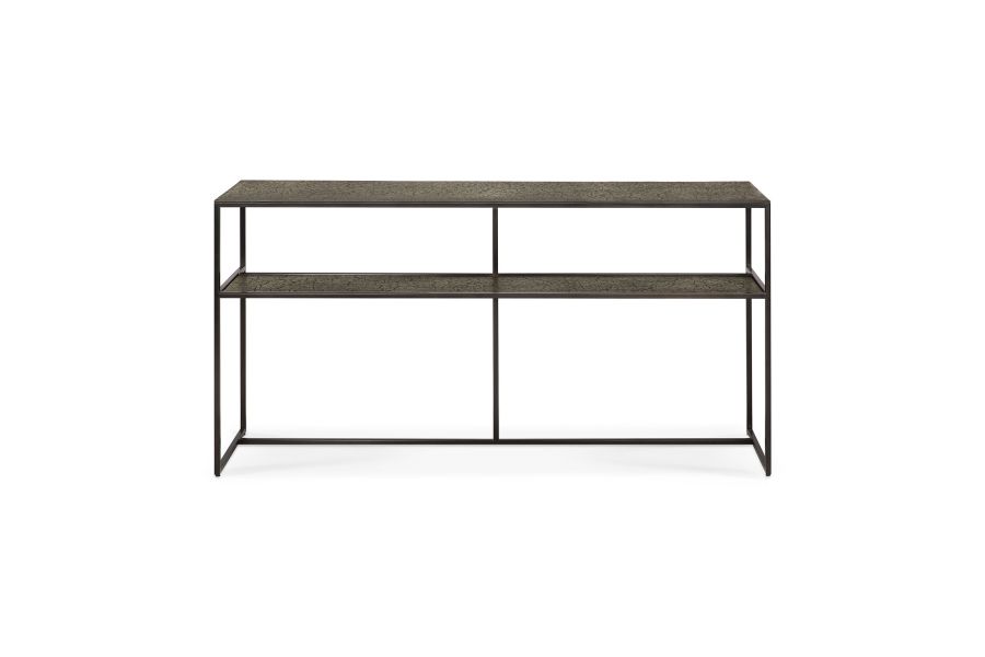 Het oppervlak van het Pentagon is gebaseerd op enkele van de oudste artistieke voorouderlijke technieken en wordt gevormd door onze bekwame ambachtslieden. Natuurlijke minerale poeders en kleurpigmenten mengen zich om de unieke afwerking te vormen. De verzonken onderste plank, geplaatst tegen de dikte van het blad, zorgt voor een onthullend grafisch contrast met de openheid van de basis. Strakke lijnen en een gestandaardiseerde hoogte tonen de eenvoudige schoonheid van het metaalwerk.