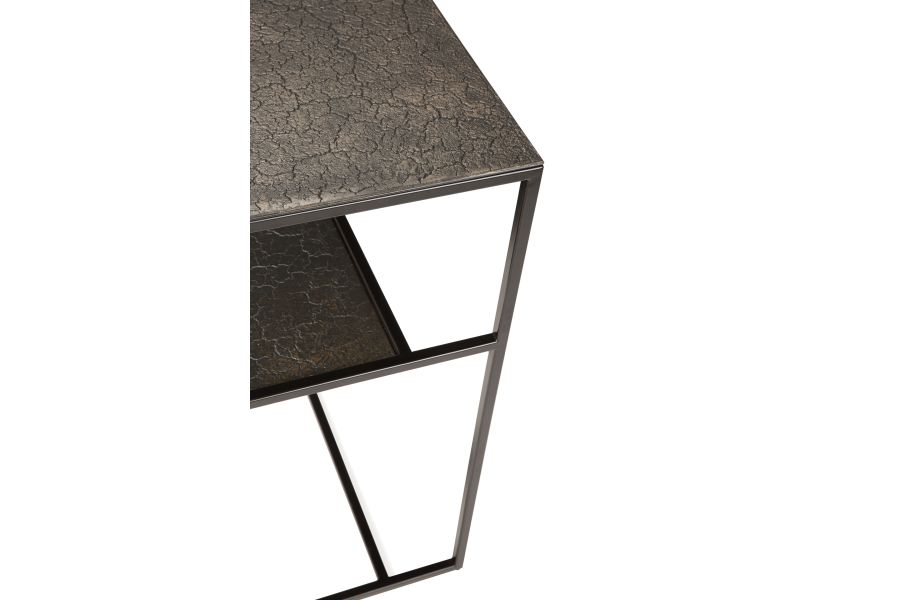 De kenmerkende tafelbladafwerking is gemaakt van minerale poeders, water, aarde, natuurlijke kleurpigmenten en metallic poeders. Gepoedercoat metalen onderstel met semi-transparante afwerking.