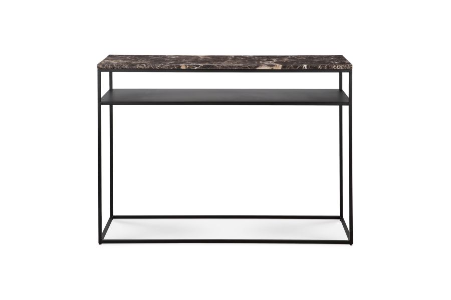 De gebalanceerde mix van eigentijdse en glamoureuze elementen geeft deze console een chique uitstraling. Dankzij zijn moderne, open metalen frame en het donkere, natuurlijk getinte marmer - een knipoog naar klassieke ontwerpen - vormt de Stone console een