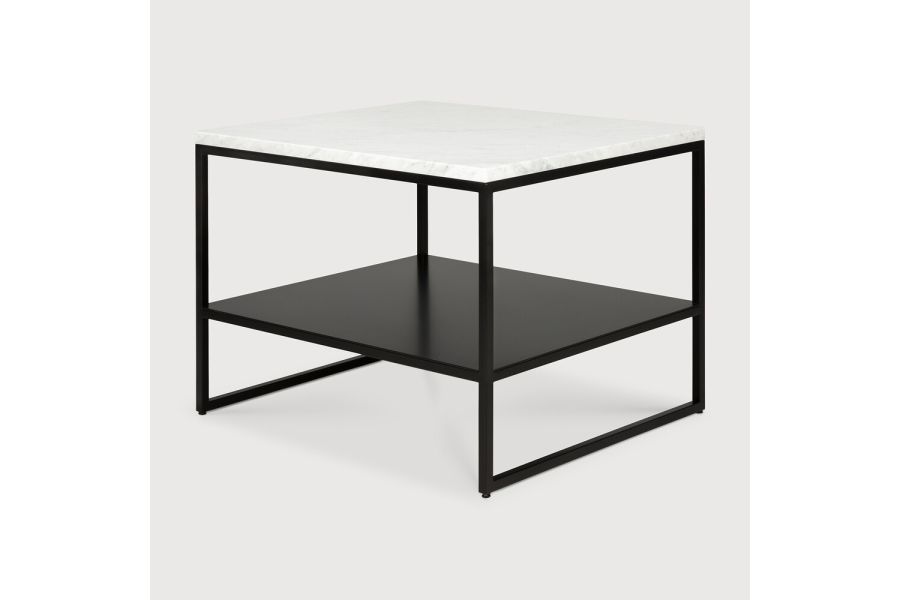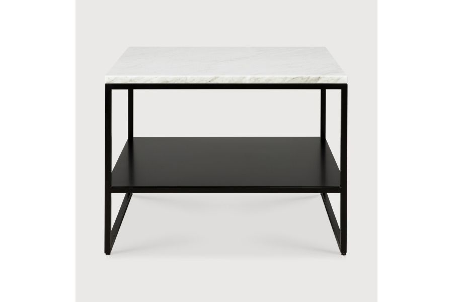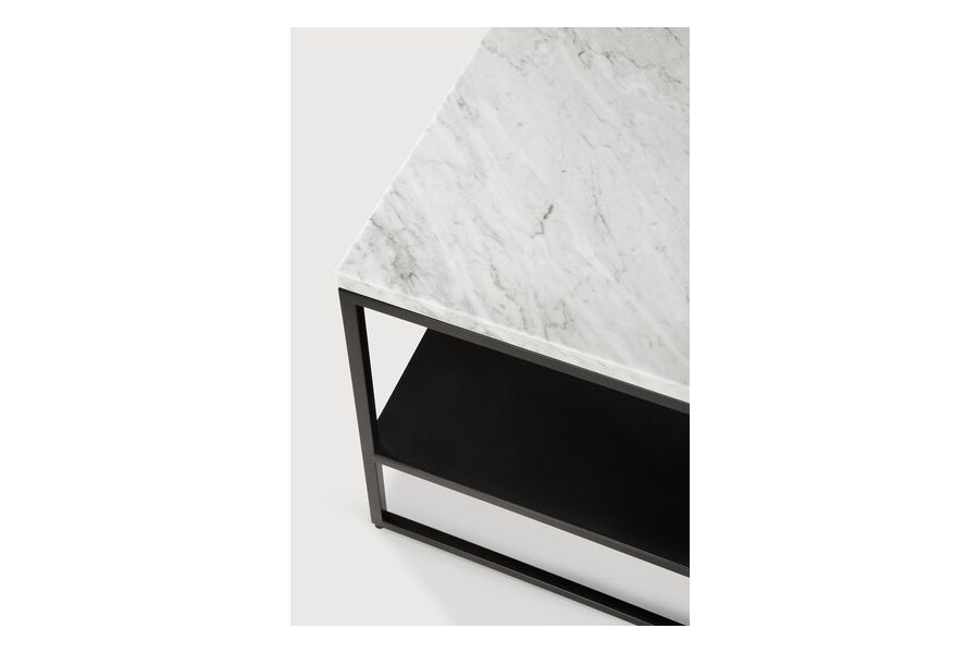 Gepolijst bovenblad van Carrara marmer met een zwart metalen frame.
