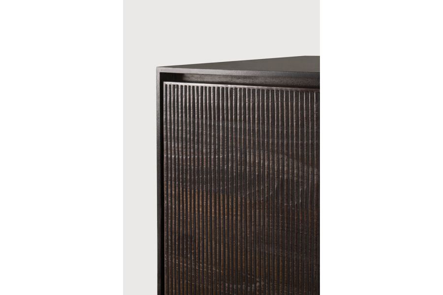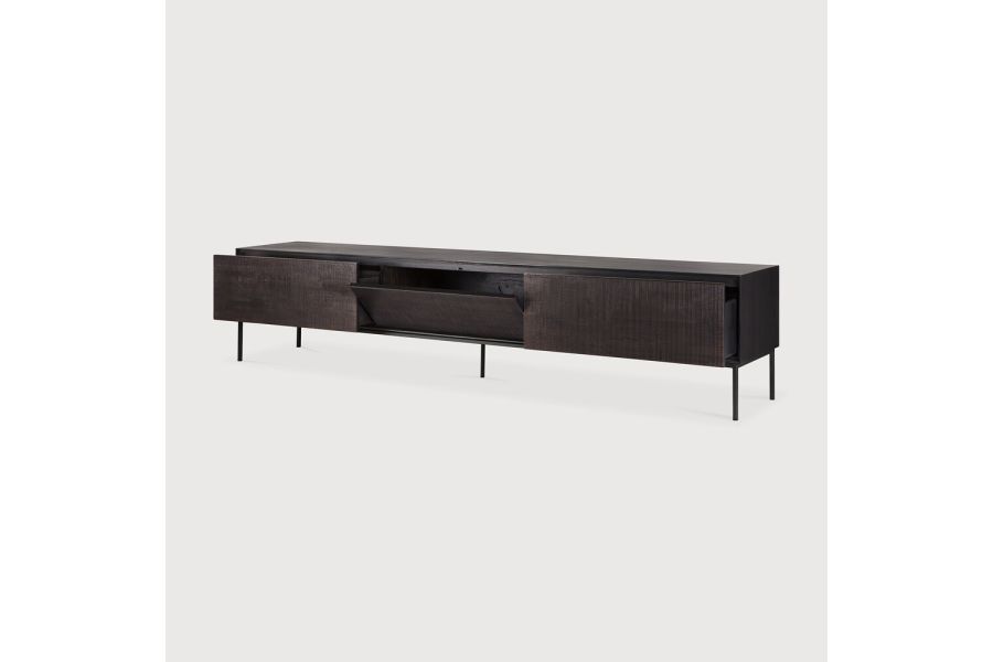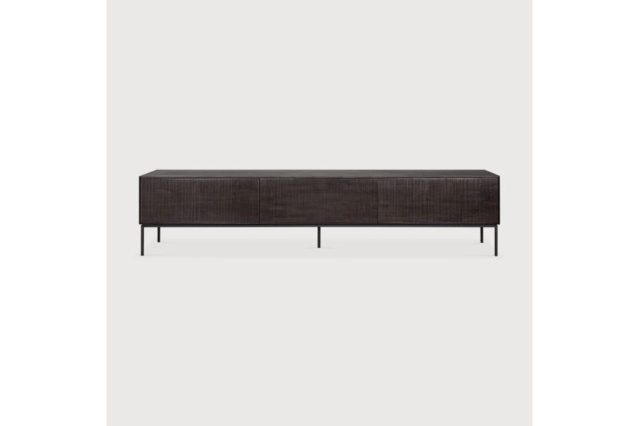 Het Grooves tv-meubel uit massief teakhout zit vol ritme en dynamiek. Elke lijn is met de hand gesneden, waardoor ieder stuk werkelijk uniek is. Kleine imperfecties zijn deel van het verhaal, sterker nog: ze geven Grooves nog meer karakter. Het resultaat is elke keer een iets ander oppervlak, elk met zijn eigen ritme en dynamiek. Het prachtige donkergetinte teak zit ook aan de binnenkant, waar planken en lades voor een veilige opbergruimte zorgen.