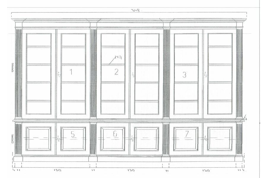 Deze grote vitrinekast is op maat gemaakt voor onze klant. De kast is helemaal demontabel en thuis bij de klant opgebouwd. De kast is in twee kleuren gemaakt. De buitenkant is kleur Elephant Breath van Farrow&Ball en de binnenkant Ral9010. De kast is helemaal met de hand geverfd. Buitenmaat van deze kast is 450 cm, hoogte 255 cm en de diepte 55 cm. De bovenkast is met 3+3 glasdeuren en de onderkast met 3+3 paneeldeuren. Het lijstwerk van deze kast is uniek. Een kleinere variant van deze kast staat in onze winkel Den Haag.