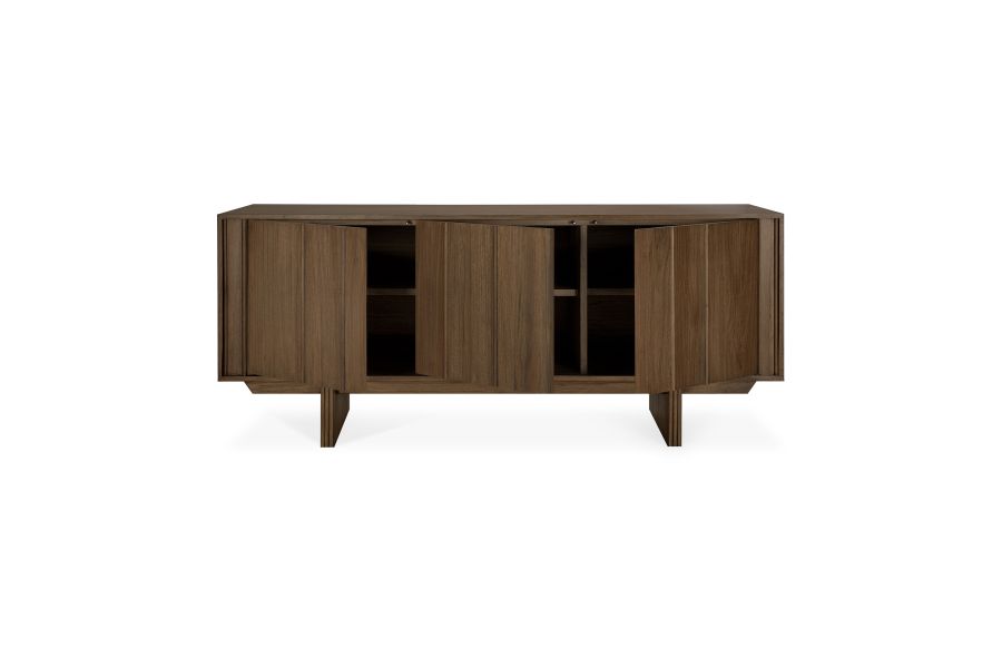 De Pillar-collectie wordt gedefinieerd door proportie en detail en verkent een architecturale taal door middel van eenvoudige vormen. Verticale houten panelen zorgen voor ritme en textuur, terwijl de warme tint van het massieve hout een aardse, maar verheffende uitstraling geeft. De strakke vorm van het dressoir biedt royale opbergruimte en voegt een rustige, evenwichtige aanwezigheid toe aan zowel woon- als werkruimtes.