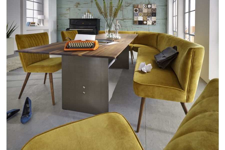 De tafel en het bankje zijn in verschillende afmetingen te verkrijgen, zowel in eiken- en notenhout. De poten van de eetkamerstoel en het eetkamerbankje zijn in notenhout uitgevoerd.