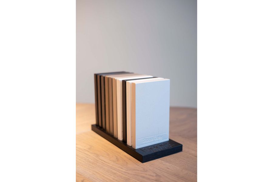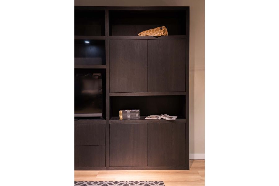 Op de foto worden drie wandkasten aan elkaar gekoppeld, waarvan jij de indeling zelf bepaald. De kast op de foto is gemaakt van eikenhout. De binnen- en de buitenkant van de kast heeft de kleur ‘Double Tinted’.