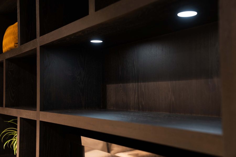 De indeling kun je zelf bepalen. De kleur op de kast in de winkel is 'Double Tinted'. Kast bestellen zoals in de showroom, gebruik artikelnummer: 1014315. Let op: De verlichting heeft een meerprijs van € 370,- per 2 spots.