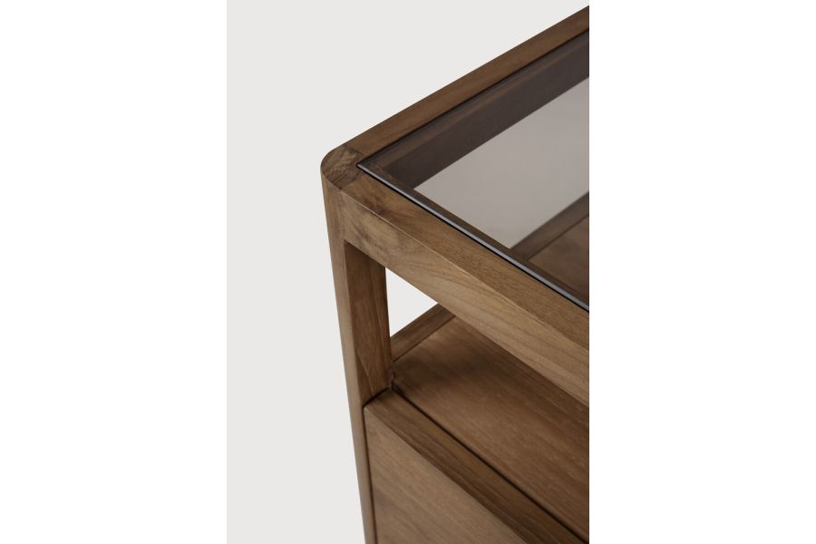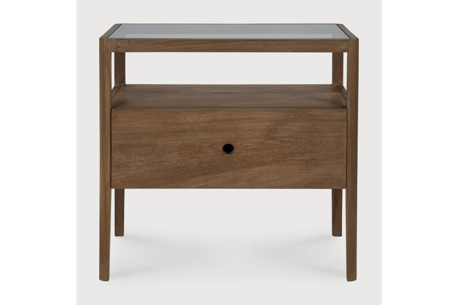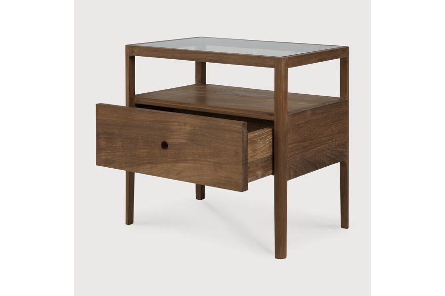 Spindel nachtkastjeMet zijn ene lade, open ruimte en licht taps toelopende poten is het Spindle nachtkastje de perfecte, no-nonsense aanvulling op het opvallende Spindle bed. Hergebruikt teakhout biedt een werkelijk unieke afwerking voor elk item – de oor