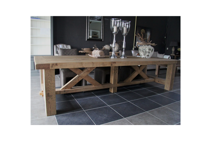 Deze heerlijke robuuste eettafel is gemaakt van een 4cm dik massief rustiek eiken. Het blad is omrand met een 4cm dikke balk waardoor het blad aan de randen 8 cm dik is. Aan de kopsekanten is het blad afgewerkt met een T-stuk waardoor deze een unieke uits