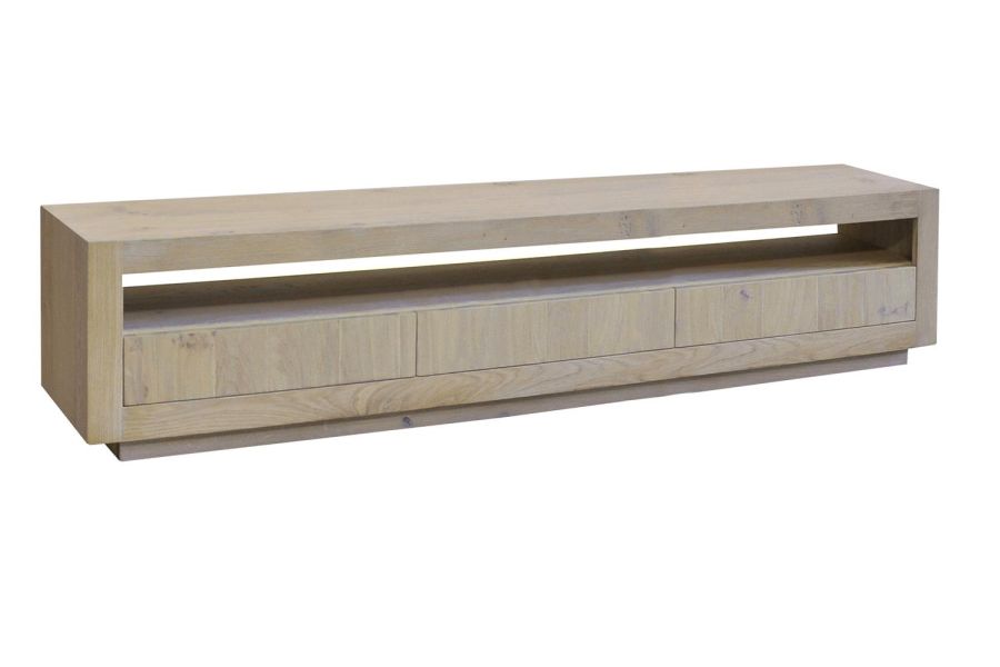 Tv-opzet Helder met 3 greep loze laden met push to open systeem en 1 open vak. De laden lopen over ladegeleiders met een soft-close systeem. De kleur en de bewerking van de kast is eiken basic lak.