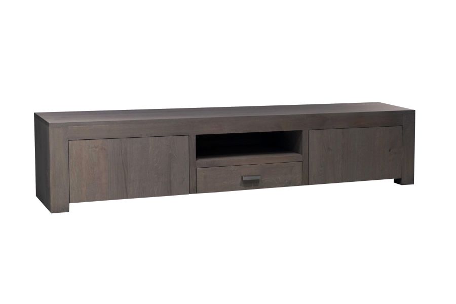 Tv-opzet Zuiver met 2 greep loze deuren met push to open systeem, 1 lade die loopt over ladegeleiders met een soft-close systeem en een rvs greepje en 1 open vak. De kleur en de bewerking van de tv-opzet is eiken rustiek dubbel gerookt.